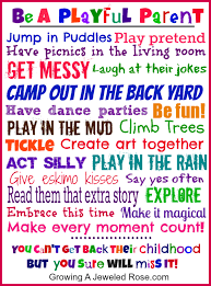 Bermain kubangan air... Bermain pura-pura... Piknik di ruang keluarga... Tidak apa-apa rumah berantakan... Tertawa ketika anak bercerita lucu... Berkemah di halaman belakang... Pesta dansa... Bersenang-senang... Bermain lumpur... Memanjat pohon... Saling gelitik... Menciptakan karya seni bersama... Bertingkah bodoh... Bermain hujan... Ciuman gaya Eskimo... Sering-sering katakan "Ya!"... Bacakan cerita tambahan... Ekplorasi...